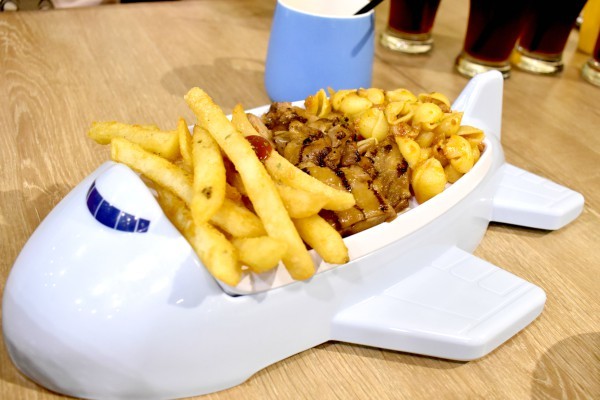送上來的可愛小飛機裡面裝載著滿滿薯條以及炭烤雞肉與貝殼麵