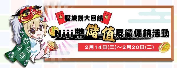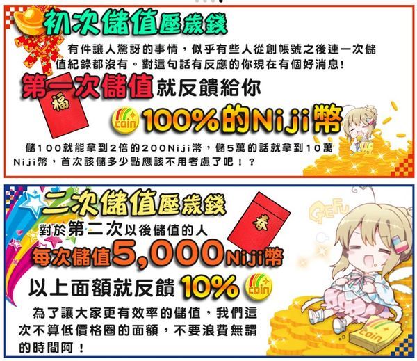 剛剛在逛網頁的時候發現Nijiyome也有出過年儲值活動了,最高還反饋100%!