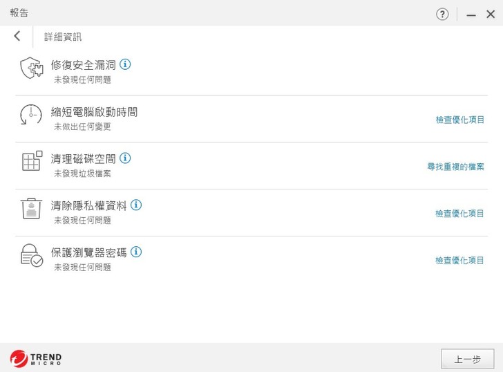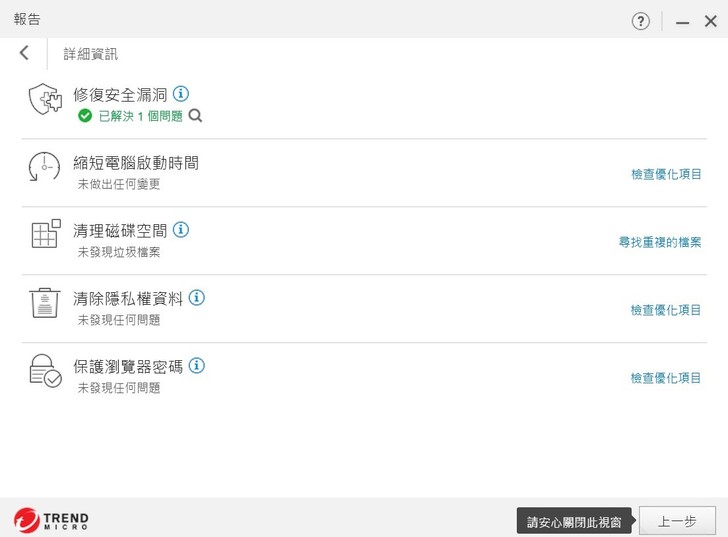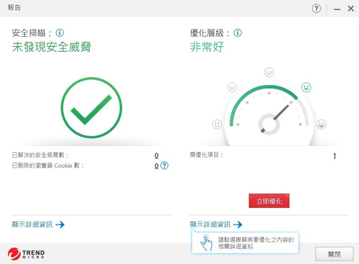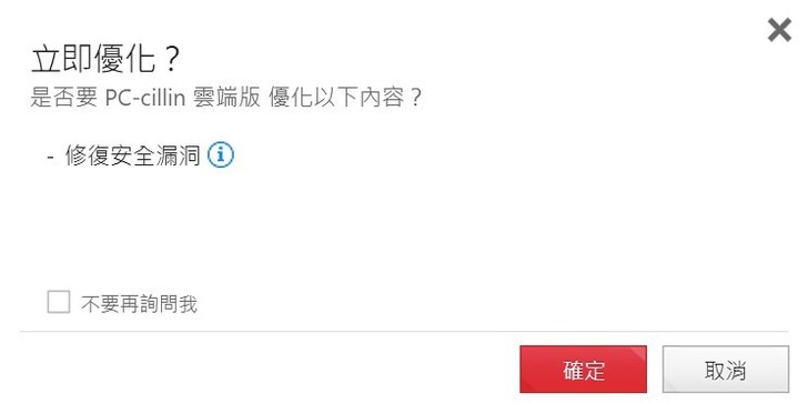 按下立即優化後,PC-cillin會先幫你修復安全漏洞。