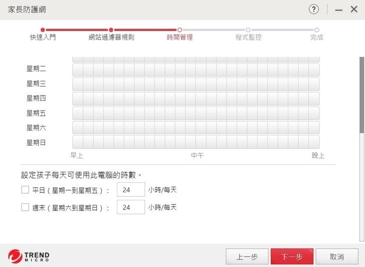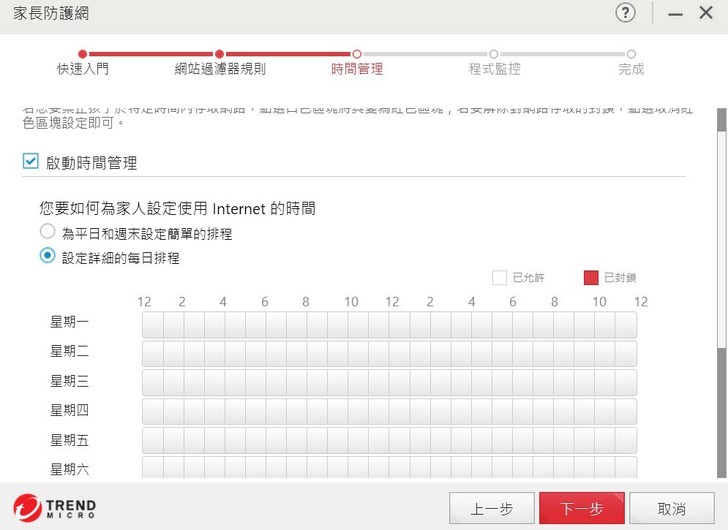 在白色區塊中點選,就能禁止孩子在那段時間上網。