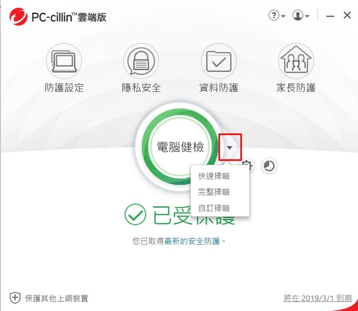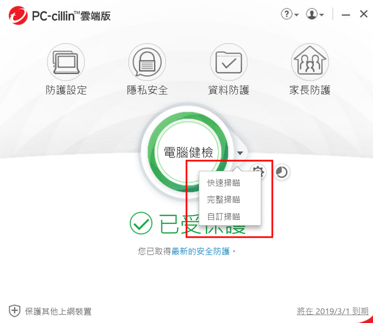 如果你將滑鼠移到我用紅方框框的地方,就會出現「快速掃描」、「完整掃描」、「自訂掃描」三個選擇。