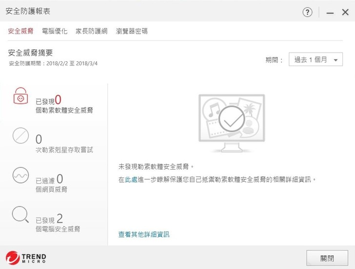 例如我的電腦有2個安全威脅,沒有勒索軟體,也沒開啟有威脅的網頁等。