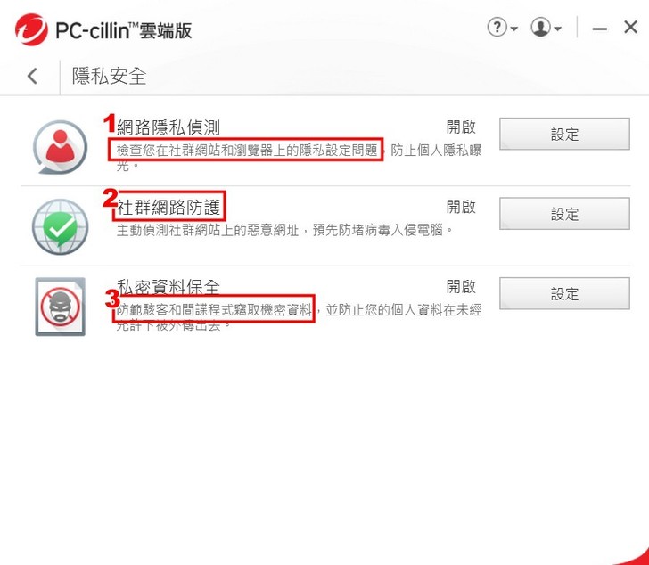 PC-cillin 2018可以主動檢查社群網站,以及瀏覽器上的隱私設定問題,防止個人隱私權曝光。