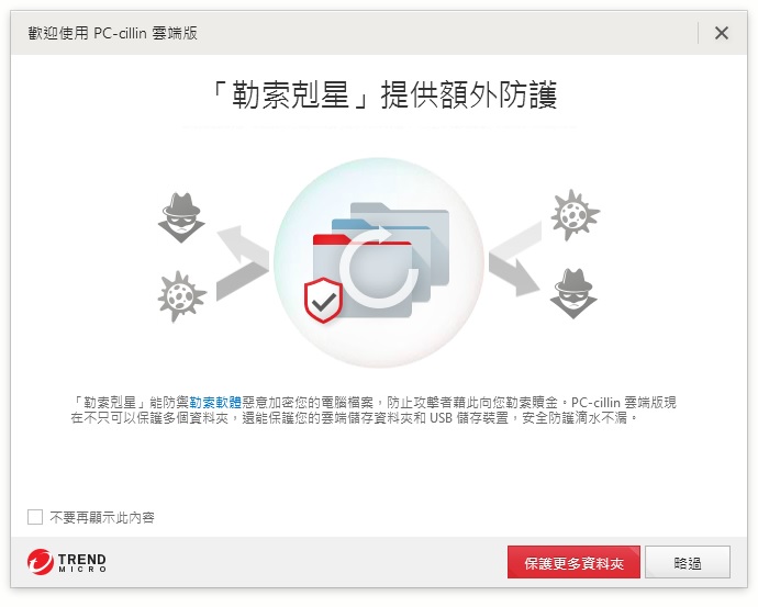 PC-cillin雲端版將80%病毒碼移至雲端,經由雲端運算減少對於電腦效能的依賴。勒索剋星更針對勒索病毒做最根本的防護,全面偵測檔案是否遭加密,資料安全由趨勢科技來守護。