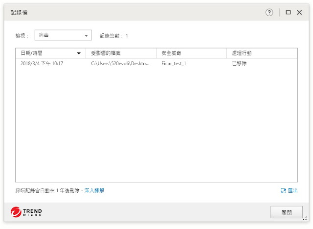 ▲ 在記錄檔中也能查詢到病毒名稱為Eicar-test_1。