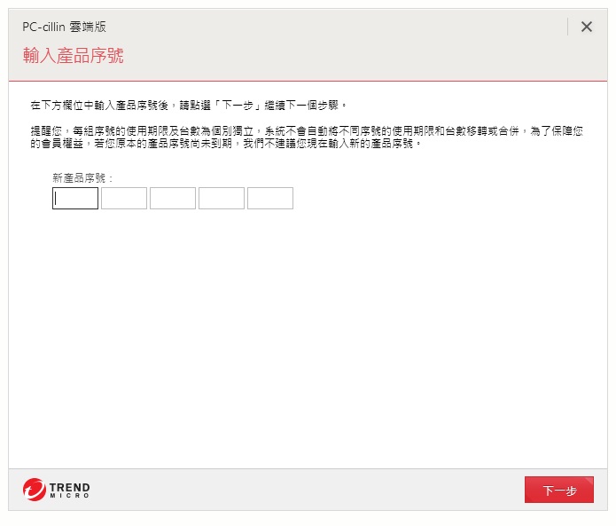 ▲ 此處輸入產品序號的說明很重要,原本序號尚未到期前,如果輸入不同的序號,將不會合併原先序號的使用期限與台數,也就是必須分別註冊使用的意思。