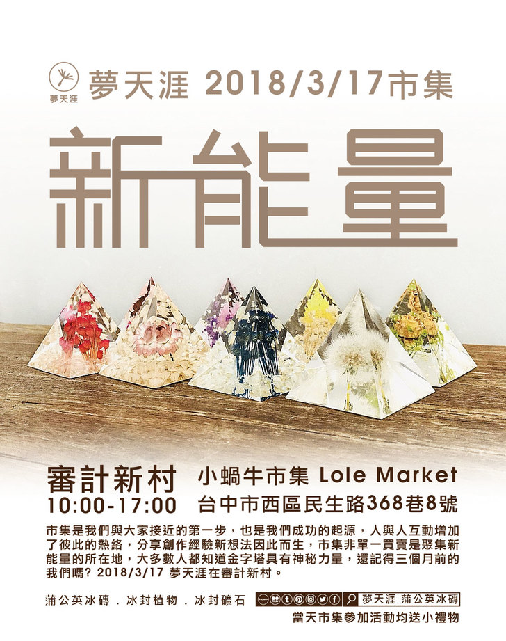 市集是我們與大家接近的第一步,也是我們成功的起源,人與人互動增加了彼此的熱絡,分享創作經驗新想法因此而生,市集非單一買賣是聚集新能量的所在地,大多數人都知道金字塔具有神秘力量,還記得三個月前的我們嗎? 2018/3/17 夢天涯在審計新村。