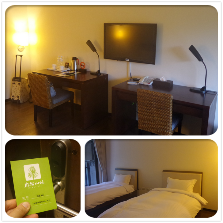 【▼】房間的門鎖是用感應卡片的方式,進入後映入眼簾的是兩張單人床以及書桌,為營造氣氛,所以燈光沒有很亮,熊熊想起JC所說不要再光源不足的環境下看電視,看來麻布山林這邊還沒有請到JC來授課。其實BenQ是可以將旗下產品移植到這邊來,像大型液晶電視、WiT智慧檯燈與無線音響都是能大幅提升旅館質感的物品。