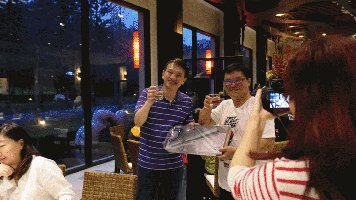 【▼】BenQ董a還沒上菜ㄟ,就帶著老婆(右)、客服主管與VIP們盡情暢飲,董a很感謝眾VIP們去年對BenQ的支持,未來有新產品還是得告大家幫忙,聽到這邊,我都淚流滿面了,想不到BenQ董a這麼器重VIP們,來,給他乾下去!