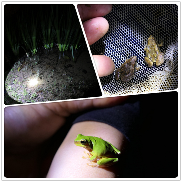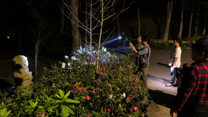 【▼】首先樹蛙哥哥帶大家往餐廳前去(再續一攤)?不是啦,是餐廳外的生態池,還記得下午發出的求偶聲嗎?這會就是去探索園區內最多種類的青蛙,為什麼說是最多種類呢?因為這邊發現的青蛙高達16種,已經是全台近一半的種類,想看青蛙來這邊就對了。