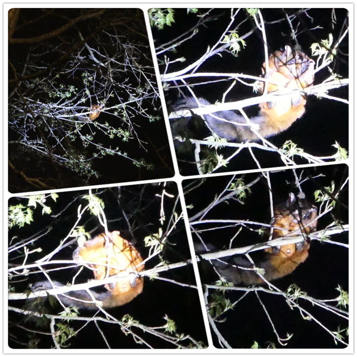 【▼】接著樹蛙哥哥帶領大家往前走,走到園區唯一的土地公廟時,突然聽見小白哥哥大喊,莫非被蛇咬了?非也,是小白哥哥在樹上發現了飛鼠,由於探照燈照著飛鼠,飛鼠會不敢動,所以就能捕抓到牠的身影,不然以飛鼠跳躍滑行的速度,一般人根本難以捕捉,樹蛙哥哥直說你們VIP真幸運!