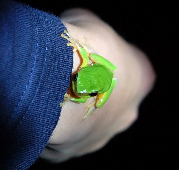 ▲ 為了近距離接觸,『樹蛙哥哥』運用他專業的捕捉技術,把牠挪到小朋友身上,讓我們可以好好的觀察,而這隻中文俗名稱中國雨蛙、雨怪的就是『中國樹蟾』,雖然叫樹「蟾」,不過他無毒。