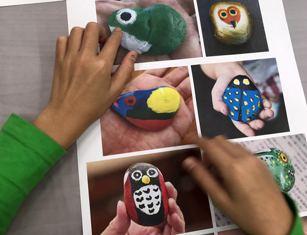 ▲ 同樣勞煩『樹蛙哥哥』當講師,帶領大想朋友一同體驗石頭彩繪+葉拓的體驗課程;首先挑選自己認為它像什麼的石頭,透過壓克力顏料來給它上色。