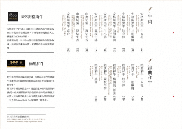 6. 不吃牛肉的朋友可以選擇1380元套餐,吃牛肉的朋友記得嚐看看1855安格斯牛與SRF極黑和牛。
