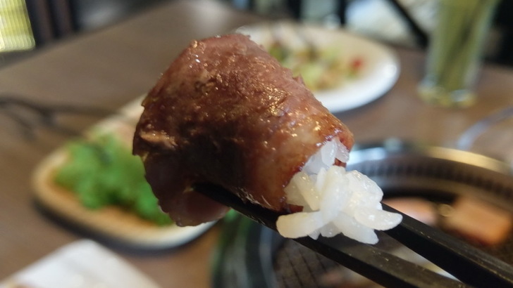 讓店家烤的好處就是店家比我們懂得拿捏火候,比較不用擔心肉烤焦了,我們只要負責吃就好了。當肉烤出水分後就要翻面,翻面後烤個一分鐘後再翻面,如此翻個3-4次之後就完成了。
