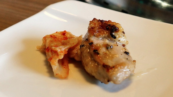 雞腿肉油質豐富,烤過之後外表有一點焦黃,但完全不乾柴,依舊非常軟嫩,搭配泡菜一起享用,口感非常好。