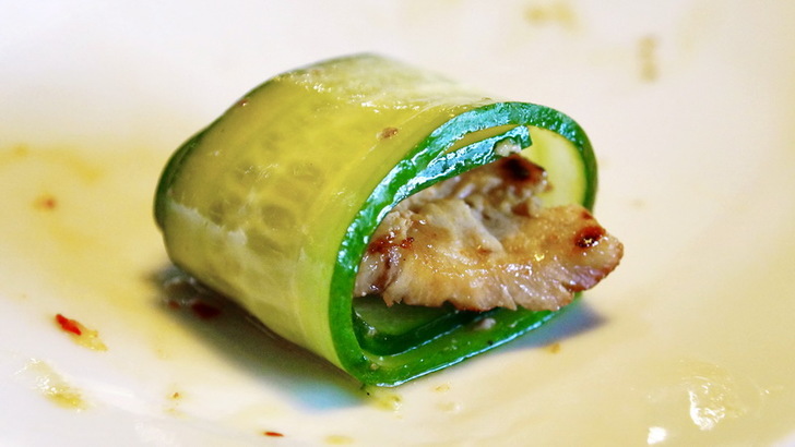 用黃瓜片把梅花肉捲起來吃,視覺新奇之外,黃瓜片的爽脆替梅花肉增添了不一樣的口感。