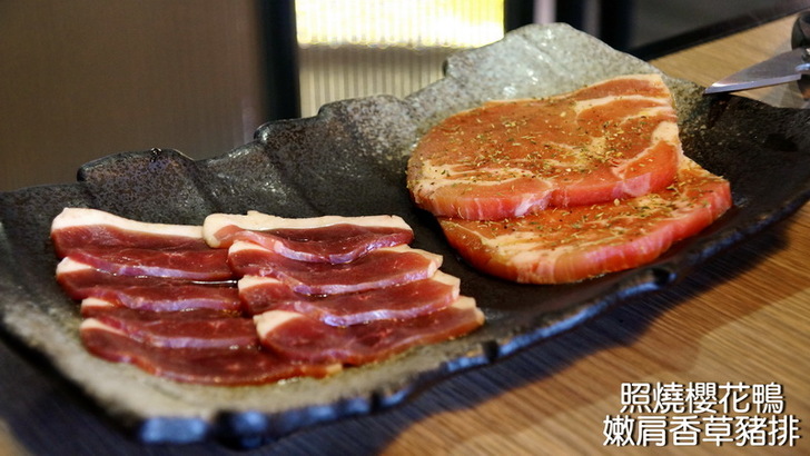 我有特地交待店家餐點慢慢上,所以把前面肉類三品烤完之後,才端上第二盤,慢慢吃慢慢烤比較悠閒啊。這是照燒櫻花鴨與嫩肩香草豬排。
