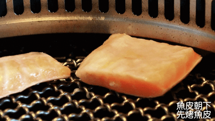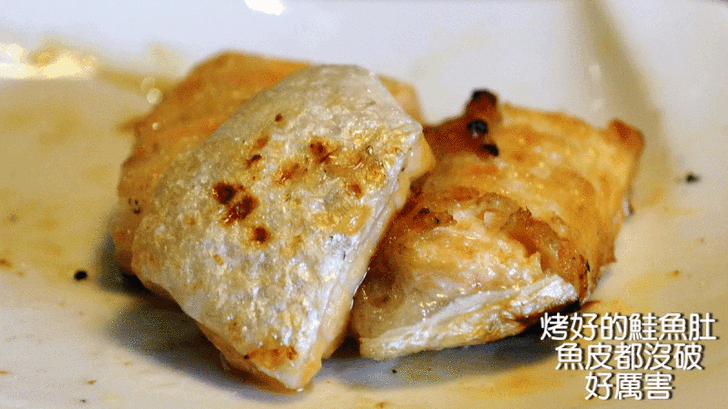 同樣也是請店家幫我們烤,鮭魚肚是店家所有食材中最難烤的食材,一定要小火放在爐邊慢慢烤。魚皮朝下先烤魚皮,烤到魚皮略有焦黃後,很小心的將魚肚翻面,同樣要小火慢慢烤。