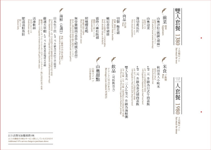 因為我沒有早上趕著打卡的壓力,又加上今天起床的晚,到餐廳已經快下午一點了,趕快點餐吃午餐吧。不過隨著年紀漸長,我已經不再是個永遠吃不飽的少年了,所以吃到飽的餐廳不再是我的最愛,取而代之的是單點或者套餐式,走精緻路線的餐廳。山奧屋正好就是一間走精緻路線的燒肉餐廳。「山奧屋」主要為套餐形式,從1380元的雙人燒烤套餐,到最高價3780元的三人燒烤套餐,有不同的價格區間,而除套餐之外,也可以單點。套餐中除了令人垂涎的各式頂級肉品,一定會搭配海鮮,包括日本生干貝、嚴選大草蝦、活凍軟絲及鮭魚肚等的選擇。而套餐附上的米飯也不簡單,所使用的是來自日本的秋田美人小町米,是越光米的改良品種,飯粒相當飽滿晶瑩,除此之外,加49元就可以升級為日式牛肉蓋飯或泰式豬肉蓋飯,也有別於其它燒肉店的作法,連飯食都有新意。