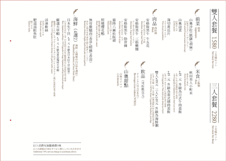 如果你覺得吃燒肉怎麼可以沒有牛肉!?沒關係,山奧屋也有各種包含牛肉的燒烤套餐。價位從1580元到2580元都有。