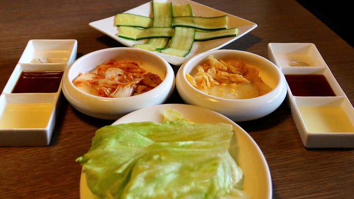 其次上桌的是山奧泡菜,薄切黃瓜片,美生菜與沾醬。(美生菜可以免費續)。泡菜有兩種口味,一是韓式泡菜,另一是黃金泡菜。沾醬的部份有三,從左至右是椒鹽,烤肉醬與檸檬汁。
