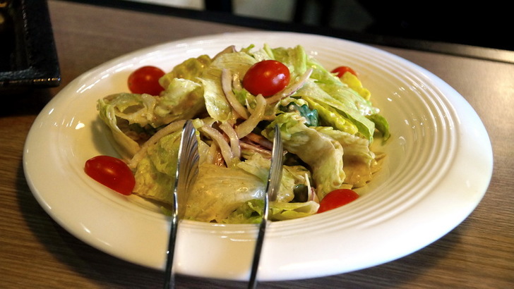 這道山奧沙拉,有凱薩與胡麻兩種醬汁可選,我選了胡麻醬汁,沙拉端上桌的時候,我看了一下裡面有美生菜,火腿絲,小黃瓜與蕃茄,第一眼看了我並不覺得有什麼厲害的,但是吃了一口之後,這個厲害了,胡麻醬汁真的很香啊。
