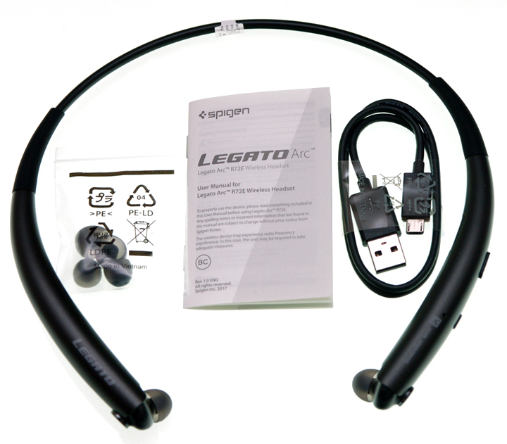 ▲ 配件包,除了Legato R72E 藍牙耳機外,還附三對不同尺寸的矽膠耳塞、使用說明書、以及一般手機、行動皆可通用的Micro USB充電線。