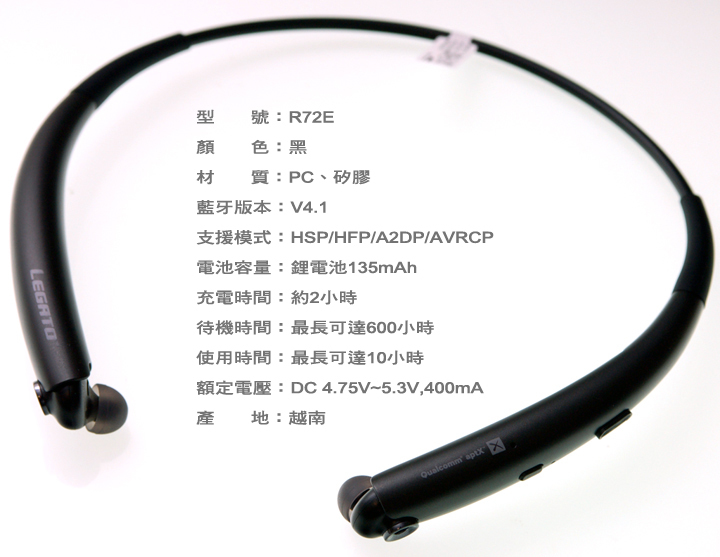 ▲ R72E 支援自動收線功能、沉穩的低音輸出、舒適頸掛式設計、輕巧且優質續航力,以及藍牙4.1無線傳輸技術。