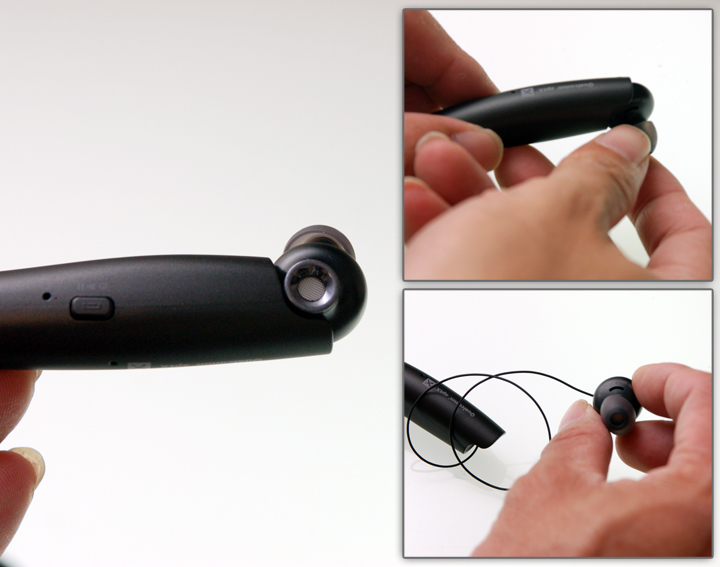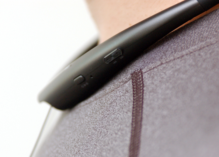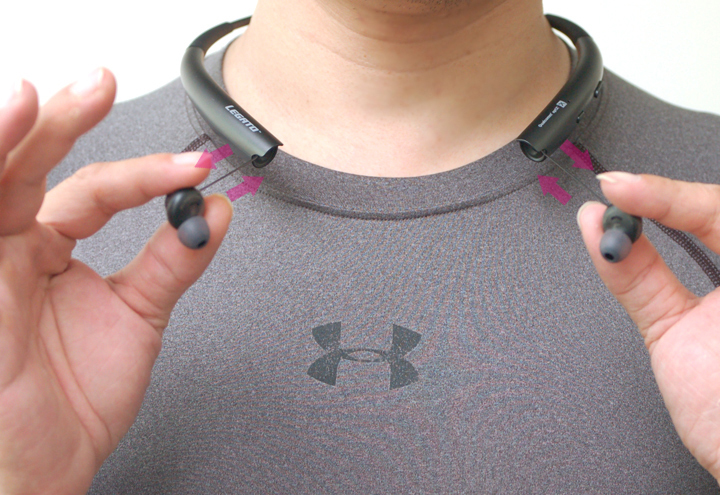 ▲ 伸縮式的耳機線設計好處,就是要聆聽前只需要以手拉出耳機單體,暫時不想聽時,可以將耳機單體收回頸圈的優勢,可避免耳機懸掛及纏繞。