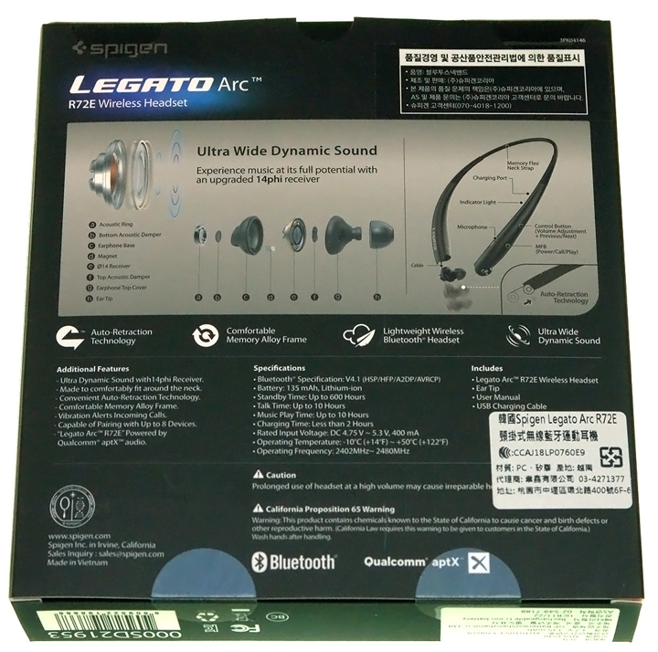▲ 從包裝盒背面爆炸圖來看,不同於一般採用10mm,Legato R72E 是一款內置14mm動圈單元的藍牙耳機,且特別之處,它還支援aptX低失真無線傳輸技術。