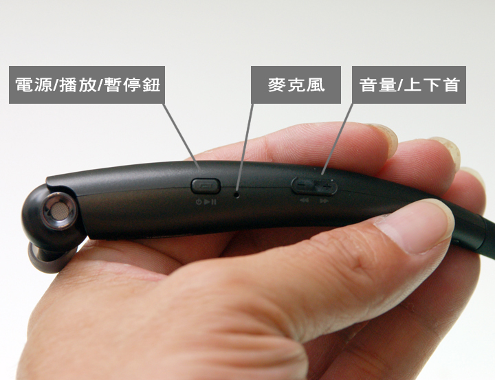 ▲ R側的則配置電源/播放/暫停鈕、麥克風收音孔,還有音量+/-與上/下首歌曲切換鈕。