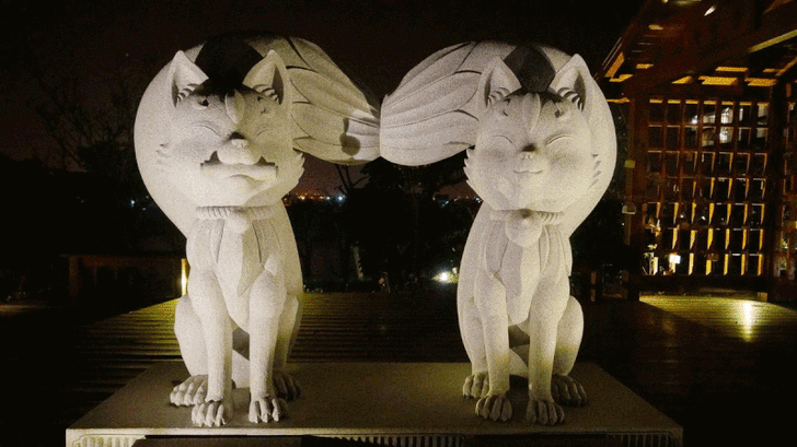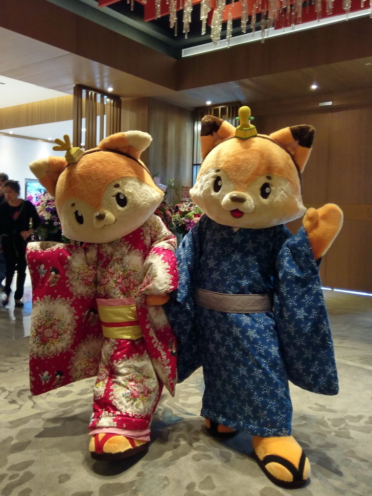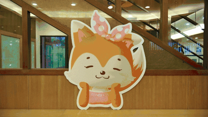 還有兩隻園區的吉祥物跟大家打招呼,這兩隻吉祥物是狐狸喔。在日本歷史上,狐狸被視為聰明且神秘的動物,甚至可變身捉弄人類。因此,人們崇敬狐狸的現象當今仍然存在,你可以在日本到處可見的神社及稻荷神社中發現狐狸相關意象。