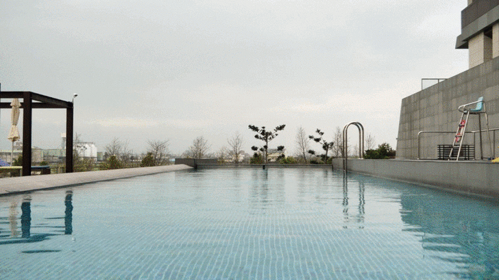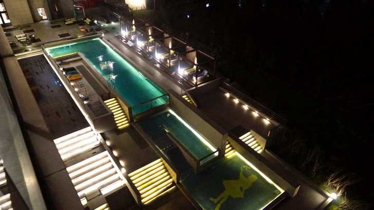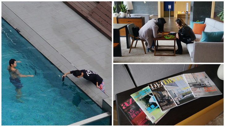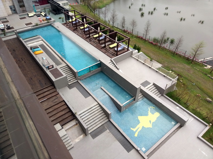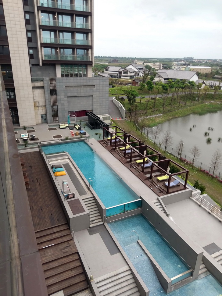 在媒體採訪董事長與執行長的時候,我趁這個空檔,簡單跟大家介紹飯店的設施,飯店裡有西式的戶外景觀游泳池,兒童戲水池,池邊也有戶外桌椅與日光休憩區。本來今天上午天氣是不錯的,可是到了下午之後天氣不佳,照片拍起來不太美。如果在夏天的晚上來個池畔BBQ應該是個很棒的活動。(開放時間07:00-18:30,清潔時間:12:00-13:00)