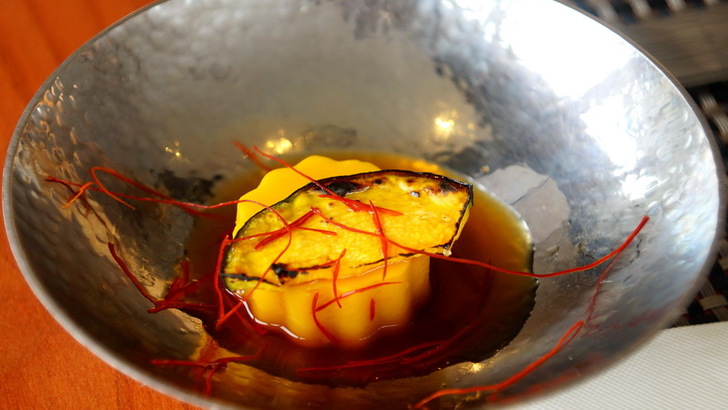 好吧,讓我們回歸到午餐,第一道上的是「主廚手工南瓜豆腐」,豆腐上放了一塊烤南瓜片,一般中菜的南瓜豆腐,是用一般嫩豆腐,加南瓜去調味料理,但是這裡的南瓜豆腐,採日式傳統工法製作,並取冬山鄉新鮮的南瓜經烤後再溫燉成泥,搭以細心磨製的黃豆,只用一點點醬汁提味,入口很清爽。