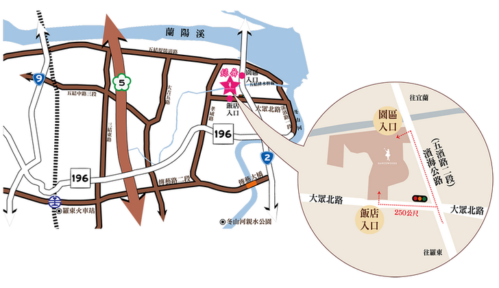 ● 由國道五號高速公路,於羅東(五結)交流道下,由迴轉道左轉傳藝路,經傳藝大橋至北部濱海公路(台二線),左轉後行駛約2公里,於大眾北路左轉即可進入飯店。