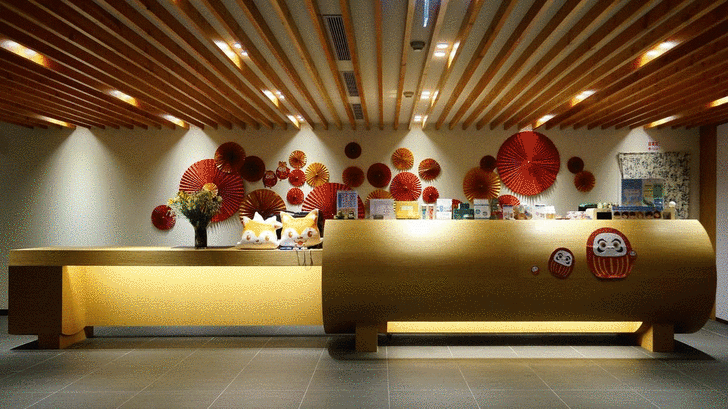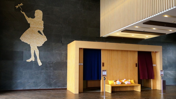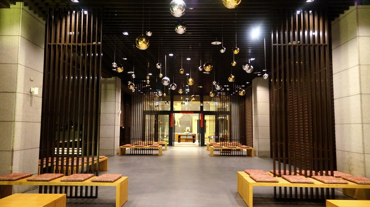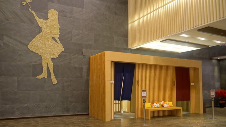 身為一間日式庭園飯店,怎麼能沒有日式風呂大浴場呢?看到藍色與紅色的浴簾代表了男湯與女湯,有沒有感覺像在日本?這一次飯店特別允許我在沒有客人泡湯的時間進去快拍一下。不然浴場內禁止攝影喔!你看,又一個超大的企業形象標誌。