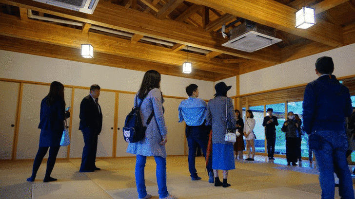 展演廳以日本傳統木構建築榫接工法建造,沒有使用釘子!!整棟檜木主體,鋪上榻榻米,處處飄散淡淡黃檜與日本藺草幽香。