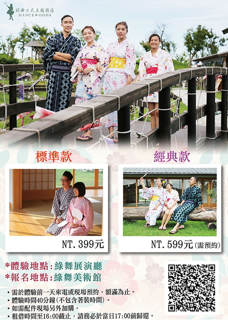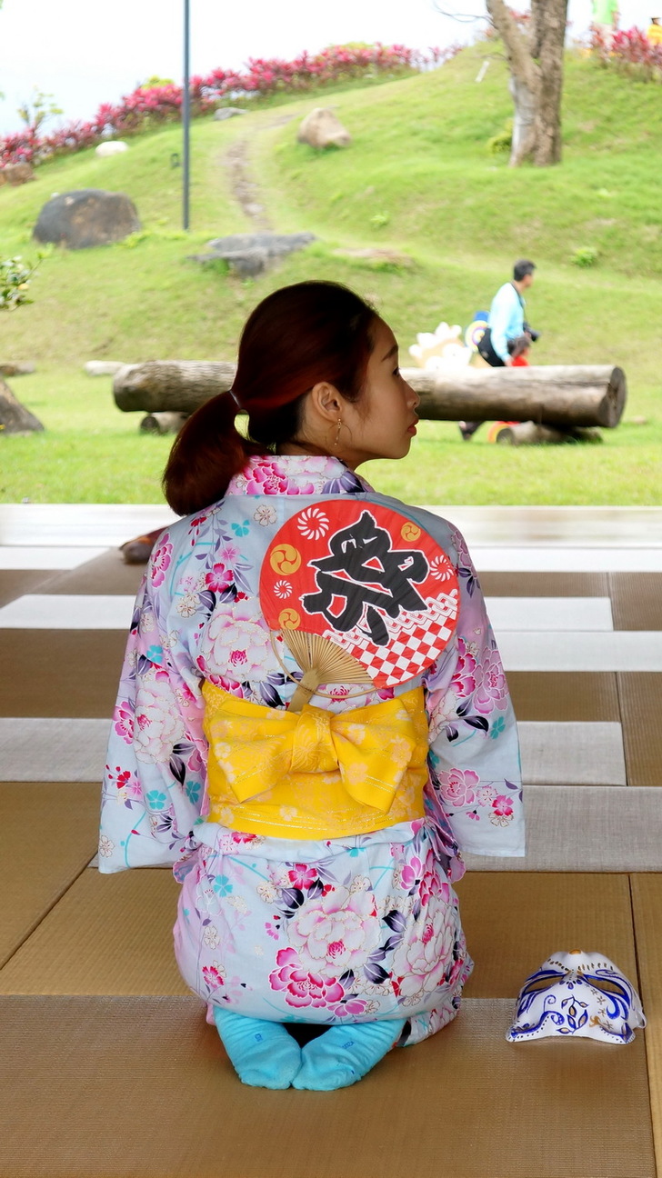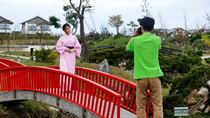 飯店有送我一張紀念照體驗券,可以請園區的專業攝影師幫你拍照。因為這裡是日式園區嘛,所以選在最具有日式風味的「綠舞展演廳」拍照是最合適的,或者在庭園裡拍照也非常棒。有住宿的旅客,可以把房間裡的浴衣換上,這樣就真的是道地日式風味了。