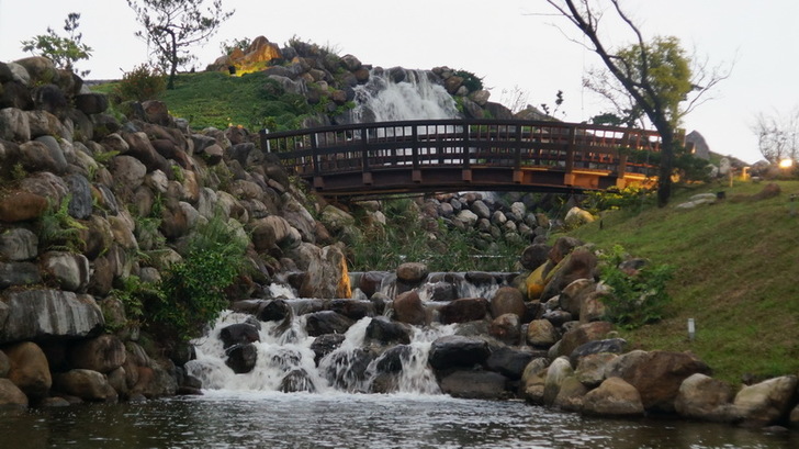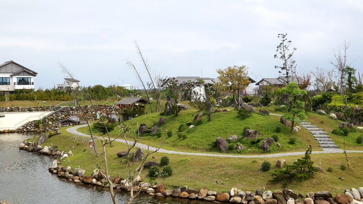 「綠舞日式園區」充分利用地勢高低落差,營造假山、瀑布與拱橋湖泊,同時加上黑松、樟樹、櫻花、圓柏等植栽,走起來心曠神怡,沿路都有不一樣的景色,「由低處往高處看」跟「由高處往低處看」景色都不同喔。