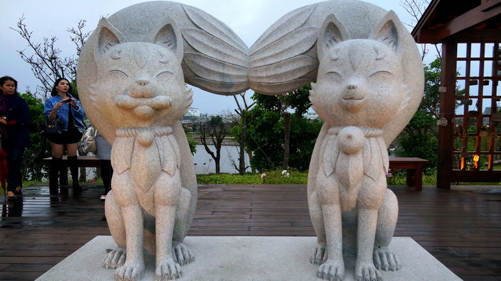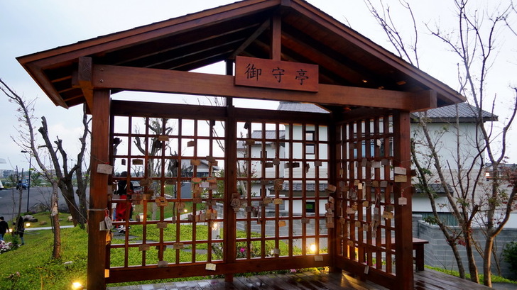 本次導覽的最後一個景點就是「御守亭」,「御守亭」是整座日式庭園的最高處,這裡有2隻可愛的狐狸吉祥物Umi和Nami石像,蓬鬆的尾巴繞成一顆心型,一旁還有木造御守亭,旅客可以在文創哉堂購買繪馬,寫好後掛在這裡祈福;御守亭不僅能從俯瞰整座園區風景,當天氣好時,還有機會遠眺龜山島,有美景之餘又好拍,可不能錯過。