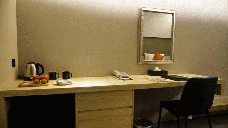 房間不錯喔,簡約低調,但又新又大又漂亮。我想大概有10坪的大小,免費的迎賓水果,茶包咖啡,甚至小冰箱裡還有5罐小鋁罐飲料(但為何是單數?)