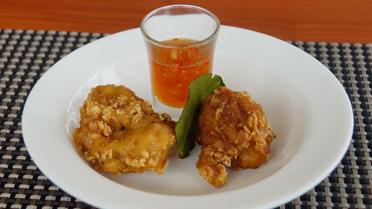 第三道是「蘭陽圤肉香茅桂丁雞」,「圤」在蘭陽地區的台語裡的意思是「炸(食物)」,其源自客家話「浮(po)」的發音,為宜蘭福佬客遺留下的客家話念法,故圤肉顧名思義是指將豬里肌肉除去筋以及油脂的部份,切成條狀,沾上佐料以及麵糊入鍋油炸而成。主廚精選嘉義桂丁雞,其皮薄肉嫩油脂適中,並以大火油炸保持肉汁的甘甜與香氣,呈現如春神的新衣般,重新詮釋經典料理,並搭配梅醬,雞肉肥嫩不甘澀又酸甜好吃,可惜一份只有兩塊,我還想多吃幾塊啊。