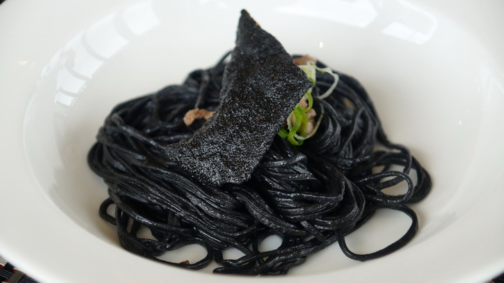 接下來是「烏魚子搭櫻桃鴨伴竹碳義大利麵」,別看麵條黑黑的就說是墨魚麵,不是喔,竹碳麵入口可不會滿嘴黑喔,麵條上面有一片炸蝦片,同樣加了竹碳,所以顏色同樣是黑色的。麵裡面我以為加了豬肉絲,其實是從櫻桃鴨上取下的鴨肉絲喔。
