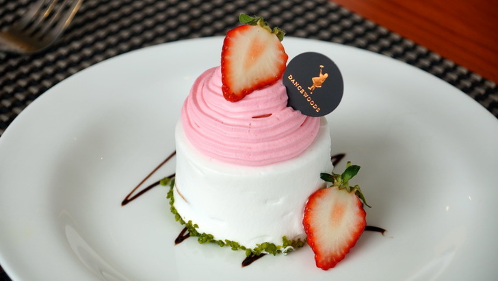 至於甜點部份,這是「春季草莓布丁蛋糕」,外圍是鮮奶油與加入新鮮草莓的鮮奶油,裡面有戚風蛋糕夾著卡士達醬與藍莓,層層疊疊,相信作工應該非常繁複。
