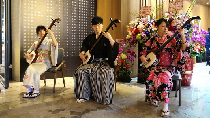 在等待開幕儀式的時間,飯店安排了日本傳統三味弦的現場表演,三味弦是日本的一種弦樂器。樂器由四角狀的扁平木質板面蒙上皮製成,琴絃從頭部一直延伸到尾部。通常會用銀杏形的撥來彈奏。身為一間日式主題飯店,用日式傳統音樂獻藝給大家也是很合適的。我是第一次現場聽三味弦,我只能說會彈奏樂器的人都好厲害,願意學習這種傳統音樂的人,我更佩服。