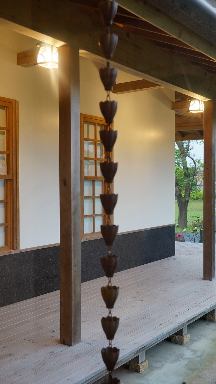 答案是古代的排水管,稱為落水鏈,也可稱為水風鈴,一串像是風鈴般的銅串,造型多為花朵或是環形、杯型等等。用途為用在建築物水槽的地方,將水槽集中的雨水導入地面的落水管功能。以落水鍊柔性的美,取代傳統落水管,當雨水流下時,透過鎖鏈傳遞導入地面,所呈現出來的氣氛,相當具有味道。聽導覽長知識喔。