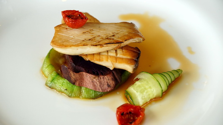 第二道上的是「松露油碳烤杏鮑菇時蔬沙拉」,上面兩塊是烤過的杏鮑菇,中間是紫色地瓜,下片墊底的是瓜類,旁邊點綴小黃瓜片與烤過的蕃茄。杏鮑菇本身是沒有什麼味道的,但是輕煎過之後還是蠻有香氣的,中間的紫色地瓜很鬆軟,倒是點綴用的蕃茄,氣味最濃郁,這點倒是出乎我意料之外。