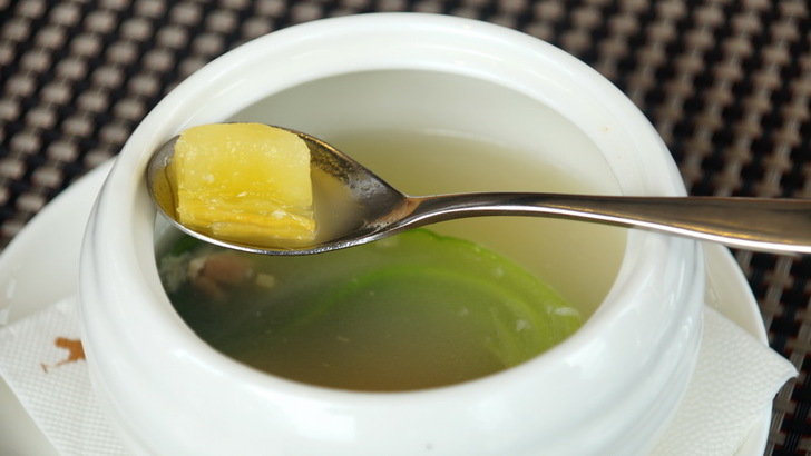 湯品是「木薯篤鮮湯」,看到「篤」這個字,我就想到上海,將上海名湯醃篤鮮,融入宜蘭春木薯搭配金華火腿與上湯同時熬製。木薯又稱樹薯,是一種富含水溶性纖維的食物,不可生食,必須煮熟後食用,木薯富含水溶性纖維的食物能加速排便稀釋腸內所產生的部分致癌毒素,是不錯的食材呢。