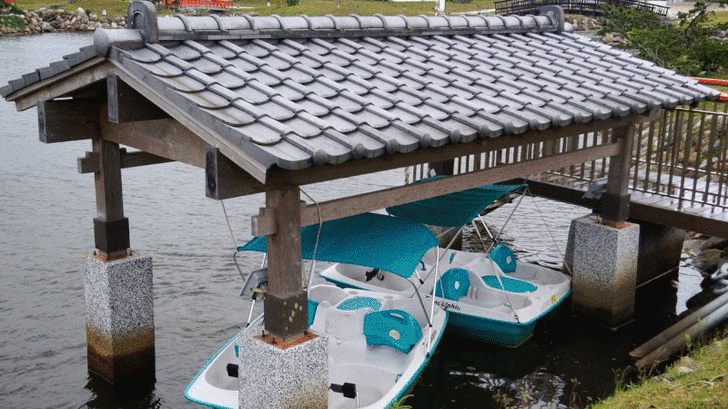 至於真山水,那也不是擺好看的喔,園區有小碼頭,是可以划船的喔,而且水裡養了許多錦鯉。我是遇到鯉魚王了嗎?這隻超肥的。